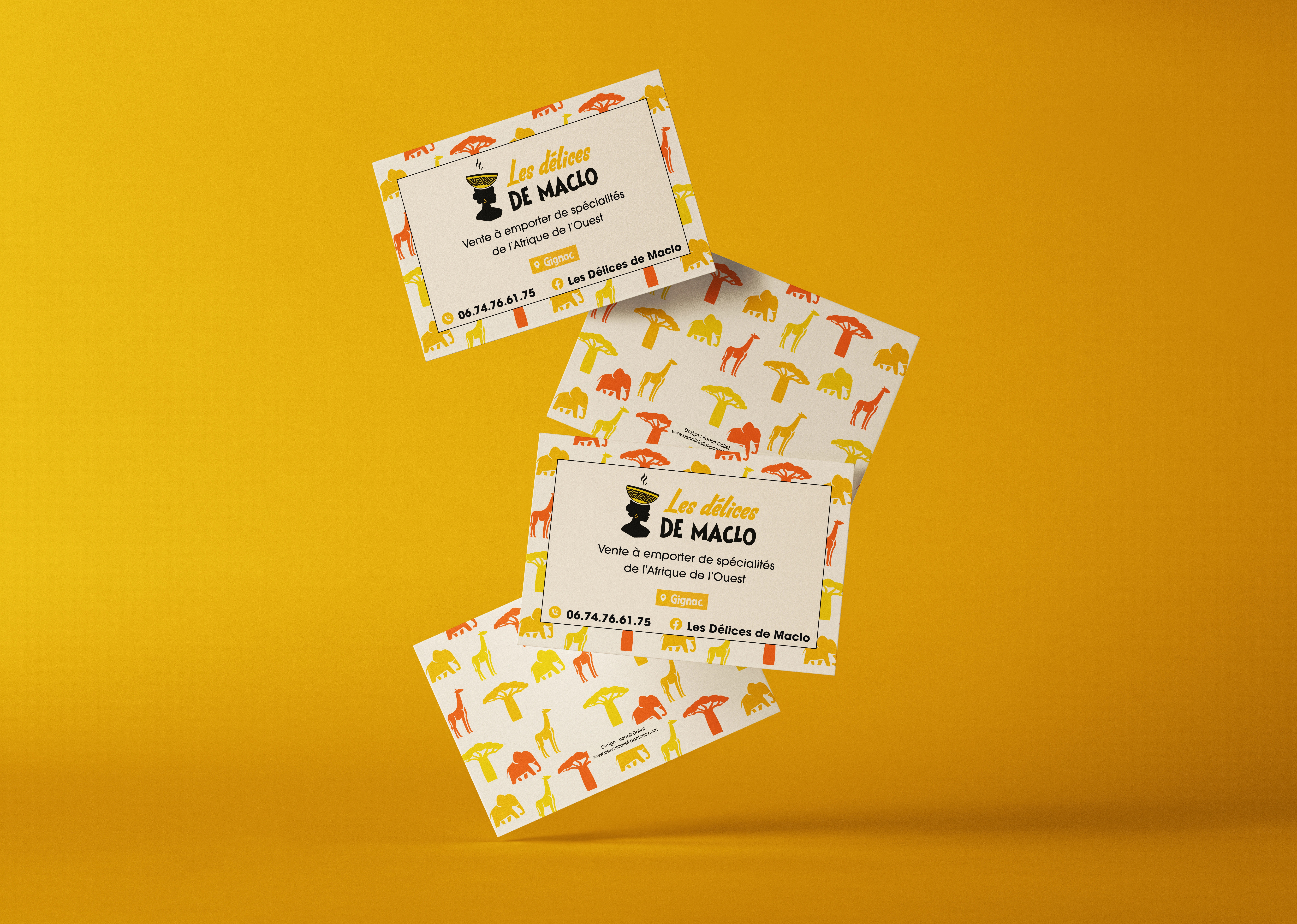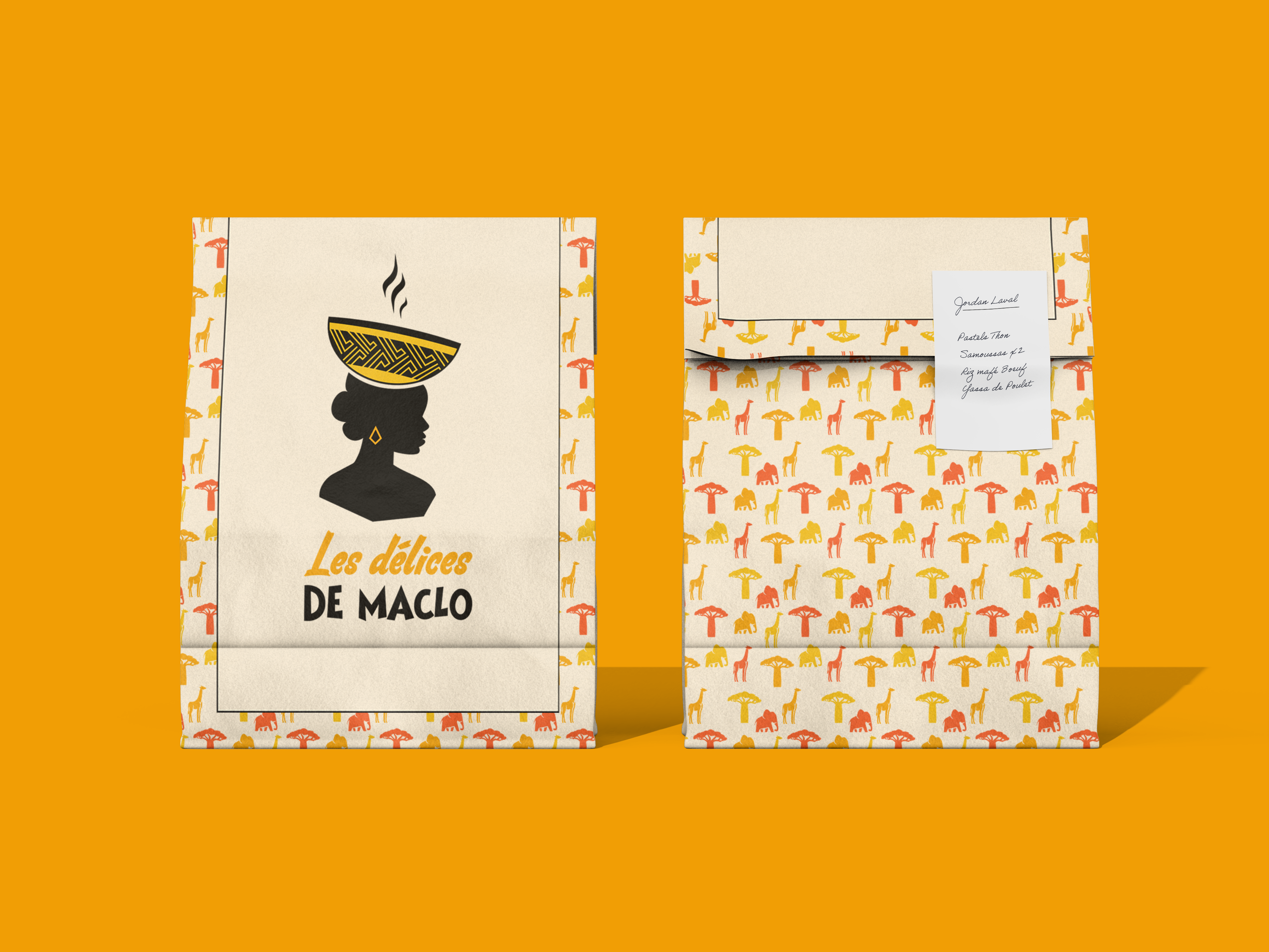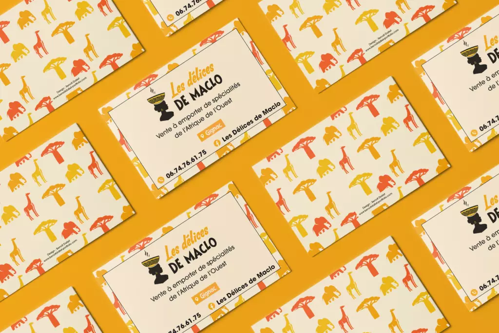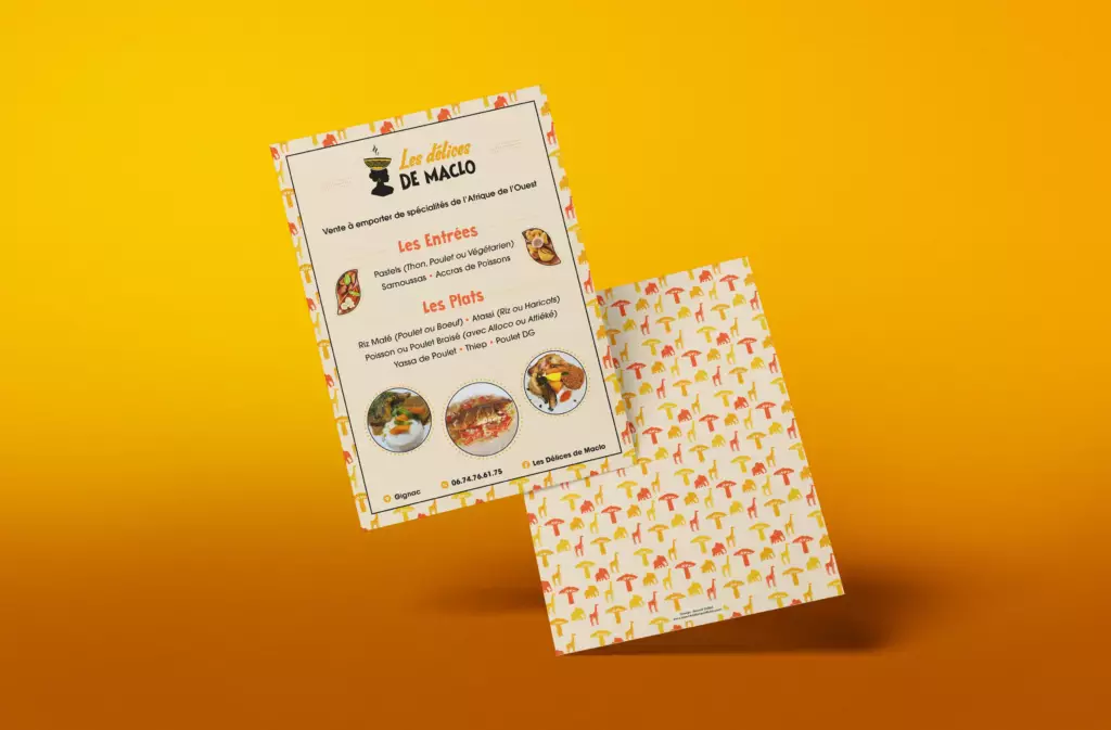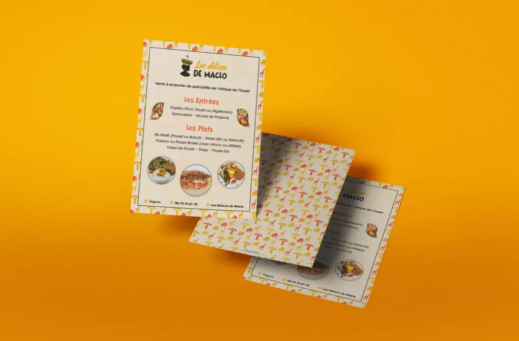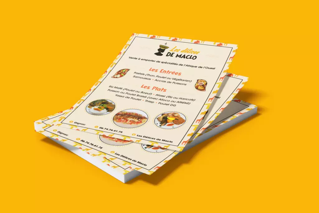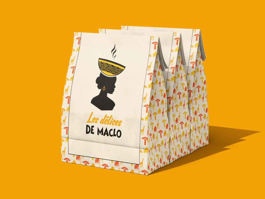 Les Délices de Maclo offers traditional West African cuisine, with a strong focus on showcasing the region’s rich culinary and cultural heritage. The full branding was designed to reflect this approach by highlighting the African origins of the ingredients, the traditional know-how, and the values of authentic cooking—through vibrant colors, expressive illustrations, and a warm, inviting artistic direction.